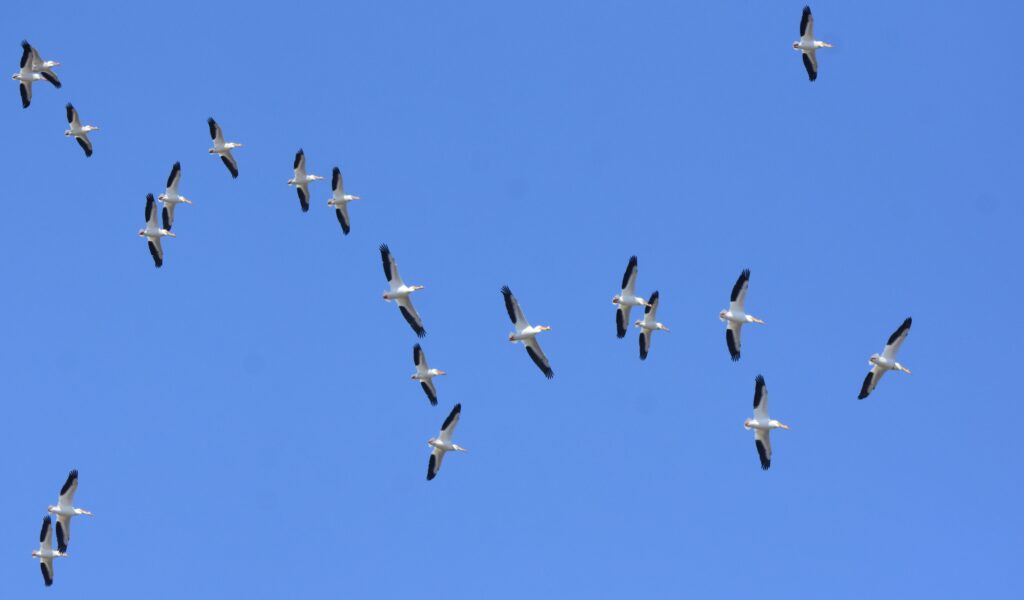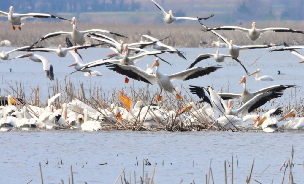 Currently enroute to northern summer nesting colonies, tens of thousands of white pelicans are making traditional stops to feed and rest on Iowa wetlands. The greatest concentrations, and some of the best viewing opportunities, can be found on the state’s larger water bodies including Coralville, Red Rock, Rathbun, and Saylorville reservoirs. Large numbers of pelicans can also be found on the Mississippi River at Lock & Dam 14 near Le Claire. In extreme northern Iowa, pelicans traditionally make layover stops at the Iowa Great Lakes, Clear Lake, and on our larger marshlands.